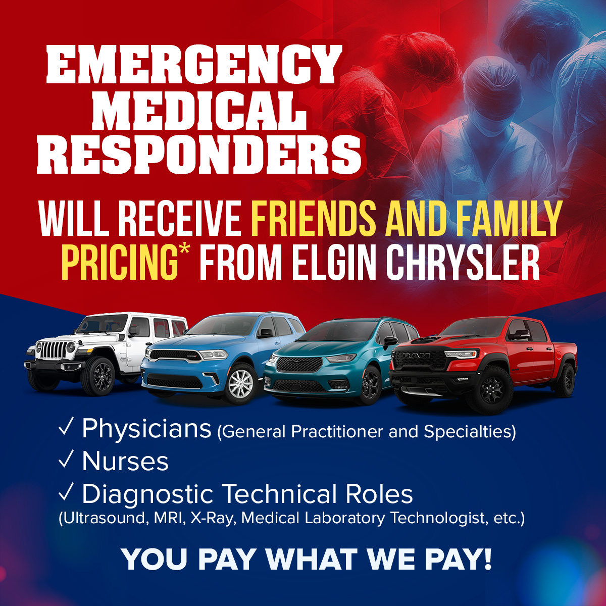 On behalf of all of us at Elgin Chrysler, we want to extend our heartfelt appreciation for the service, dedication, and sacrifice you bring to the Elgin community every single day. Whether responding to emergencies, caring for patients, or protecting our neighbourhoods, your work has a lasting impact on all of us — and we’re sincerely grateful.
